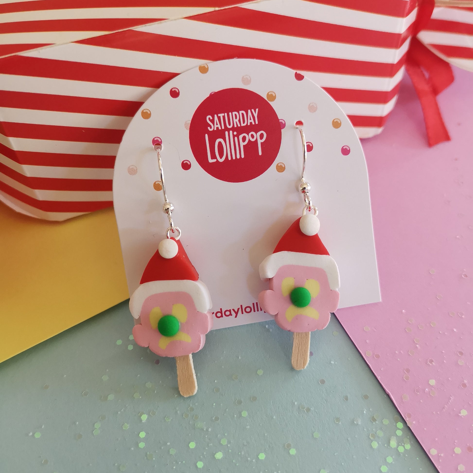 Handmade from polymer clay, these Bubble O earrings have swapped the western hat for a Santa hat. Silver plated ear wires. Earrings arrive in a drawstring bag and box. Perfect for carol concerts and the festive period.