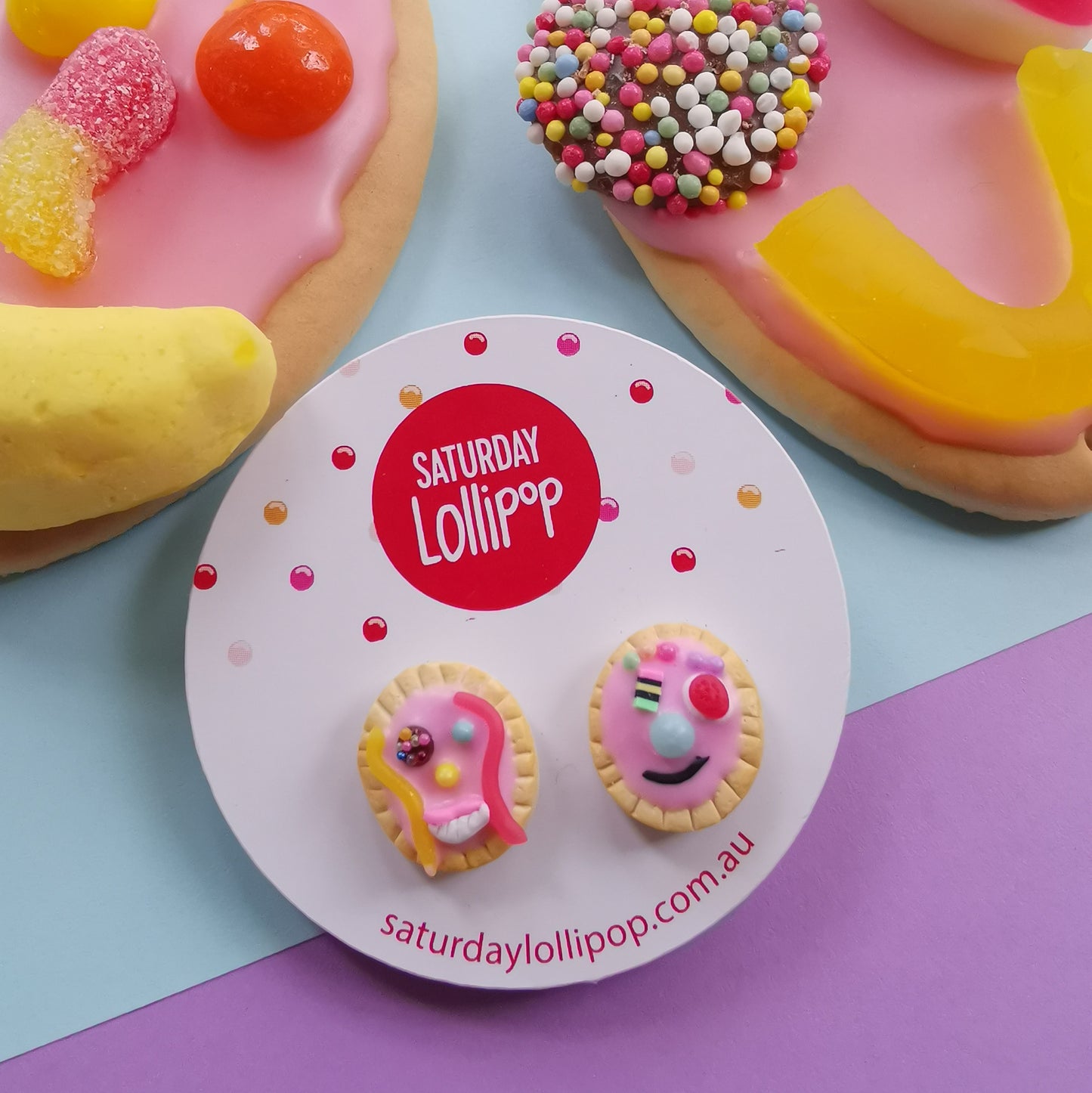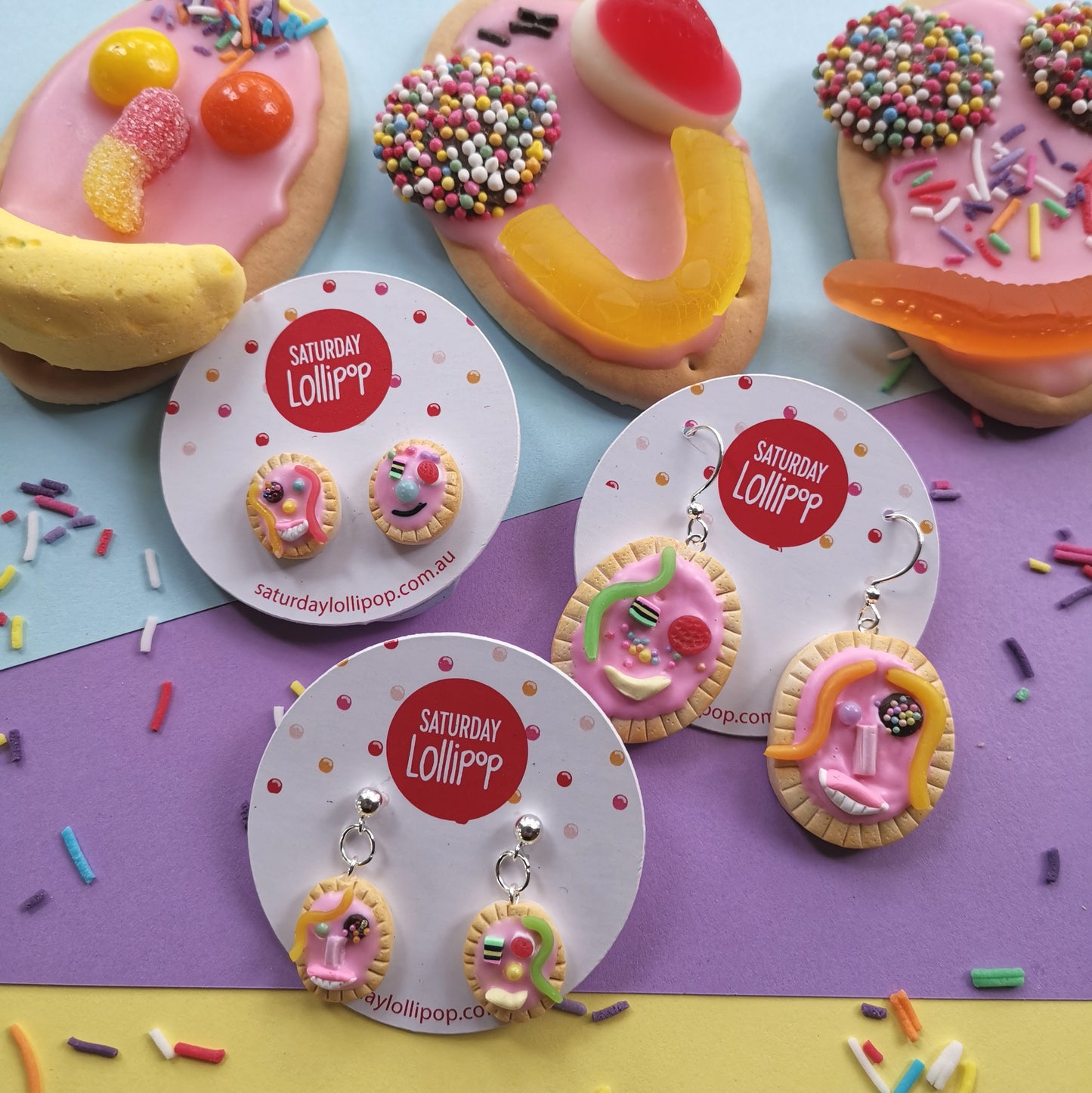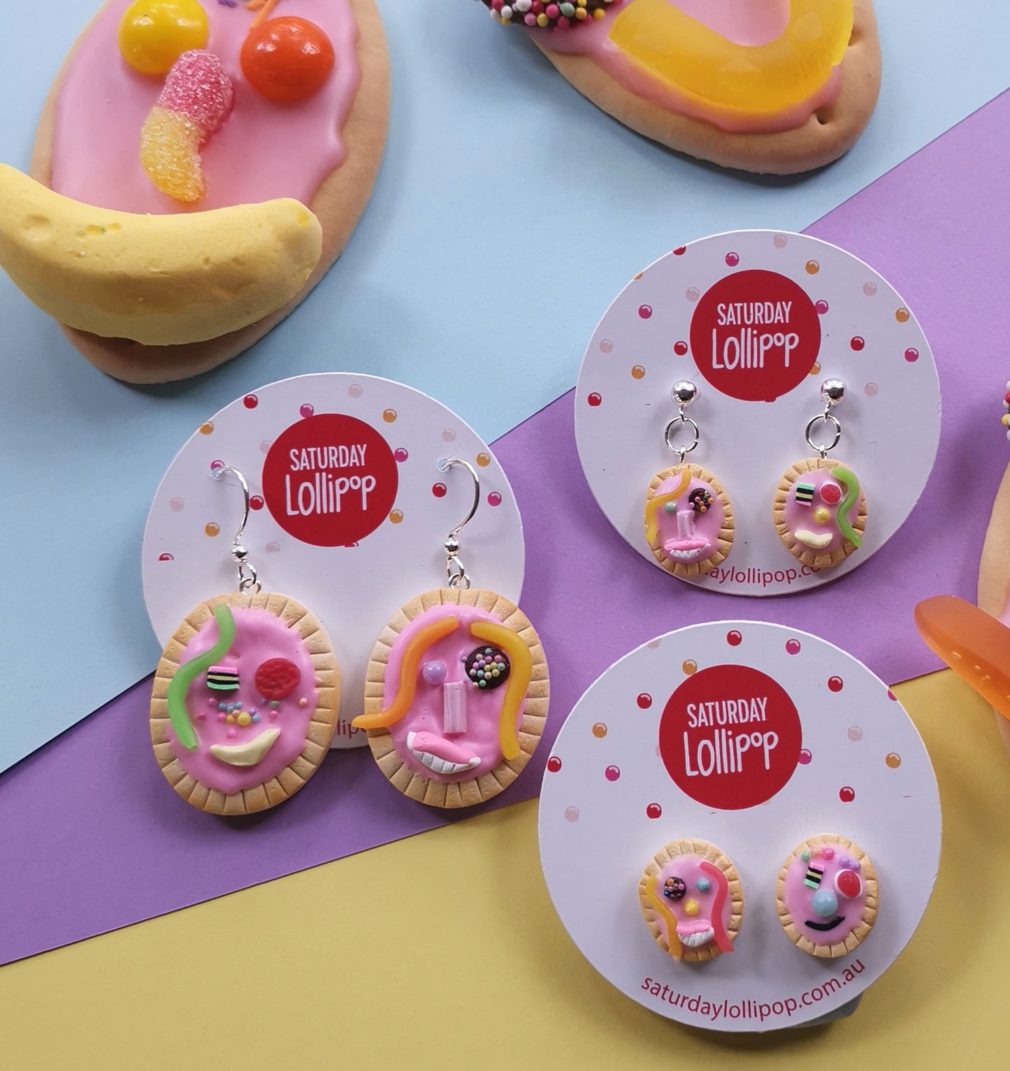 These little lolly face biscuit earrings are so fun, with great attention to detail. Handmade from polymer clay with teeny tiny snakes, licorice, freckle and party mix. Choose from dangles (3cm tall, silver plated ear wires) tiny stud topped dangles (1.5cm with sterling silver plated ear posts and clasps) or studs (1.5cm with surgical steel posts and clasps)