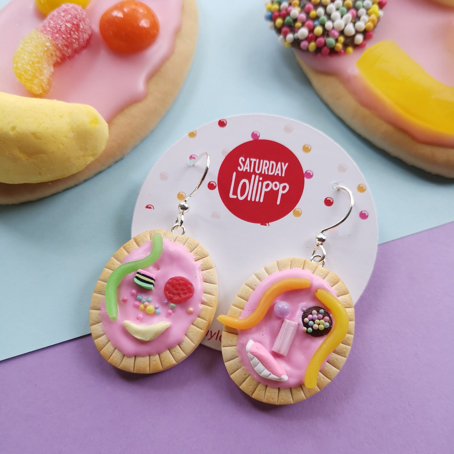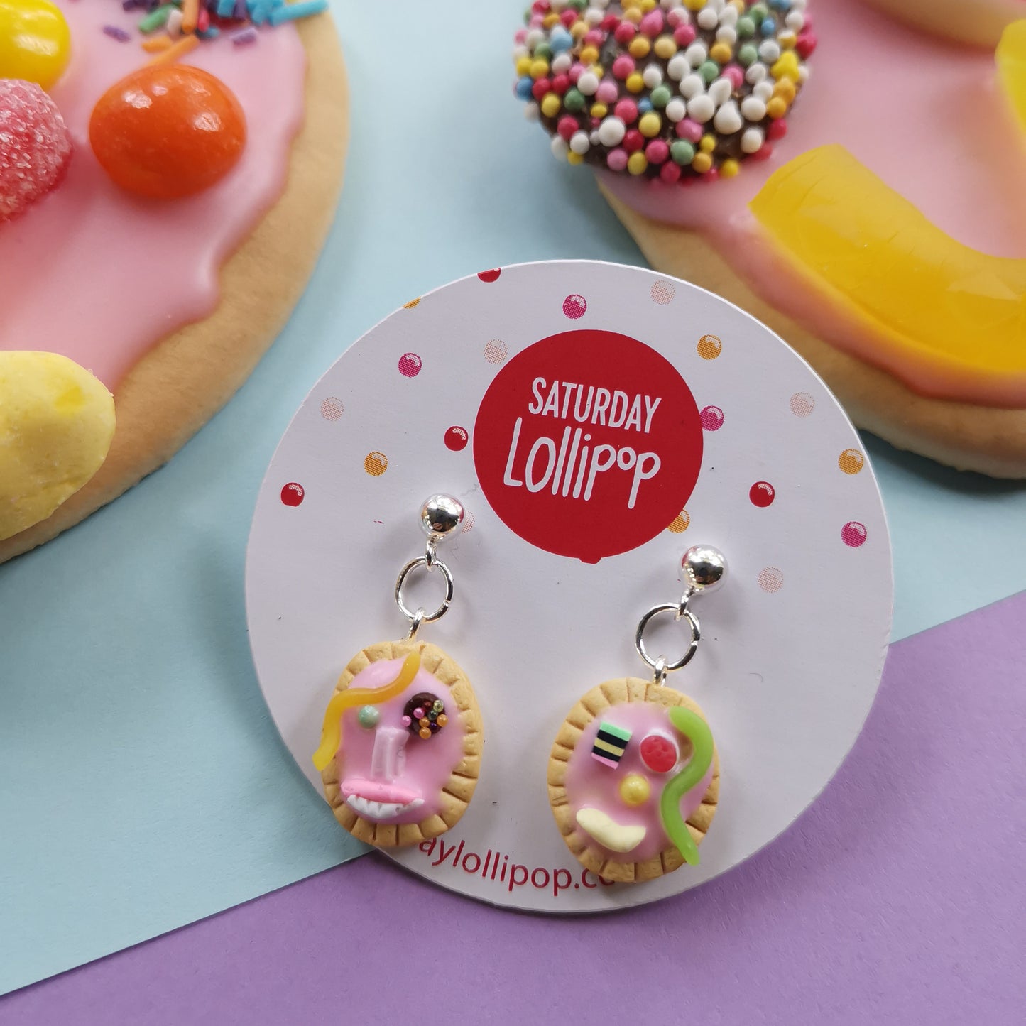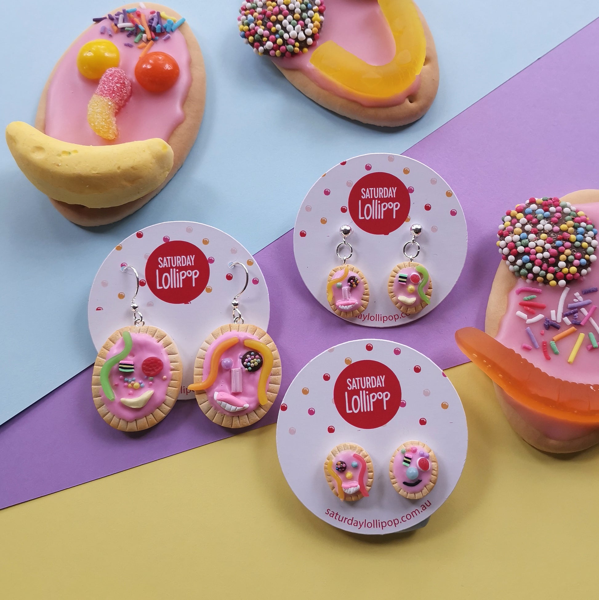 These little lolly face biscuit earrings are so fun, with great attention to detail. Handmade from polymer clay with teeny tiny snakes, licorice, freckle and party mix. Choose from dangles (3cm tall, silver plated ear wires) tiny stud topped dangles (1.5cm with sterling silver plated ear posts and clasps) or studs (1.5cm with surgical steel posts and clasps)