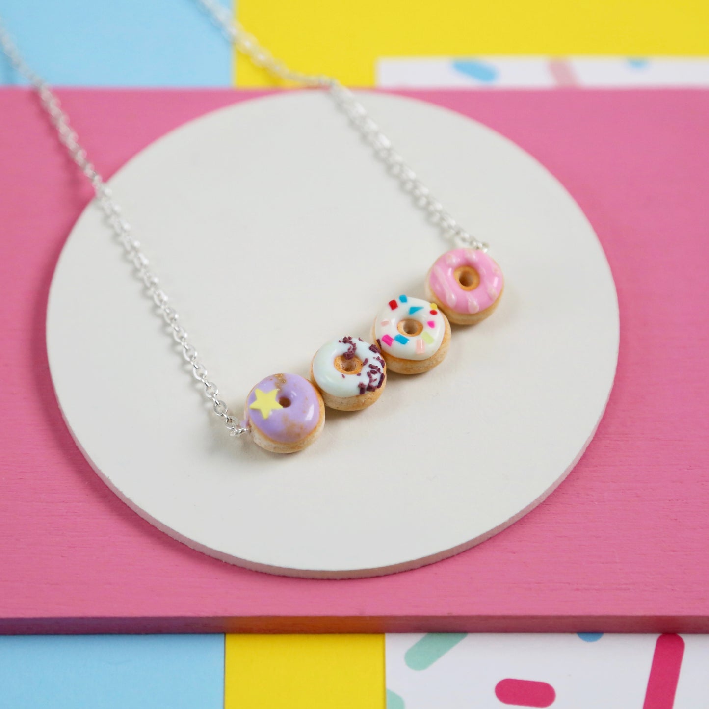 Four gorgeous little polymer clay donuts in purple, pink, mint and yellow sit on a silver plated brass chain. A fun and colourful necklace to add a little cuteness to your day.